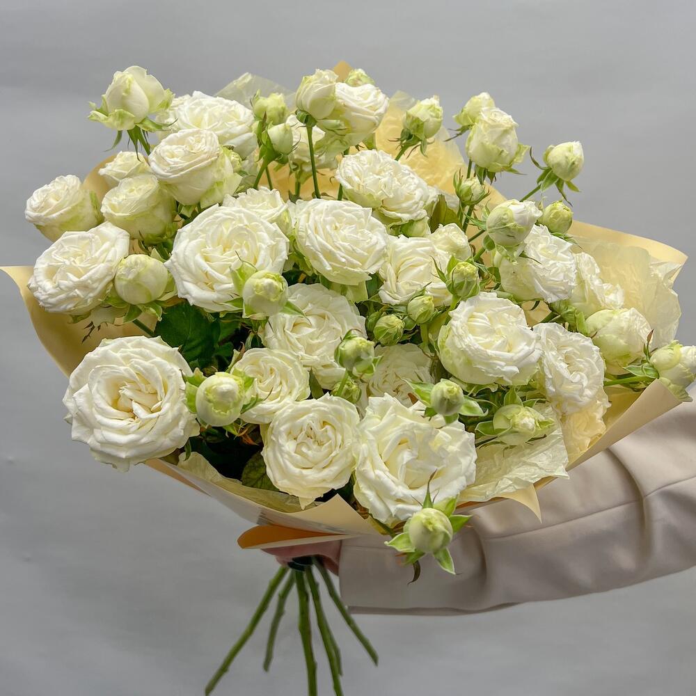 Букет из белых кустовых пионовидных роз мисс бомбастик в лаконичном оформлении