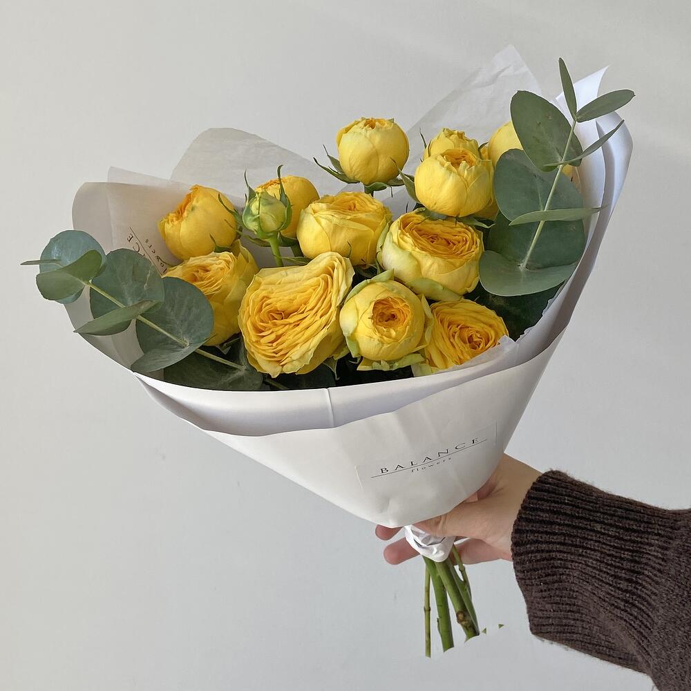 Букет-комплимент из желтых пионовидных кустовых роз с ароматным эвкалиптом подарит самые яркое настроение получателю 💛 Для наших букетов мы используем только сорта премиум класса из Эквадора, с крупными пышными бутонами.